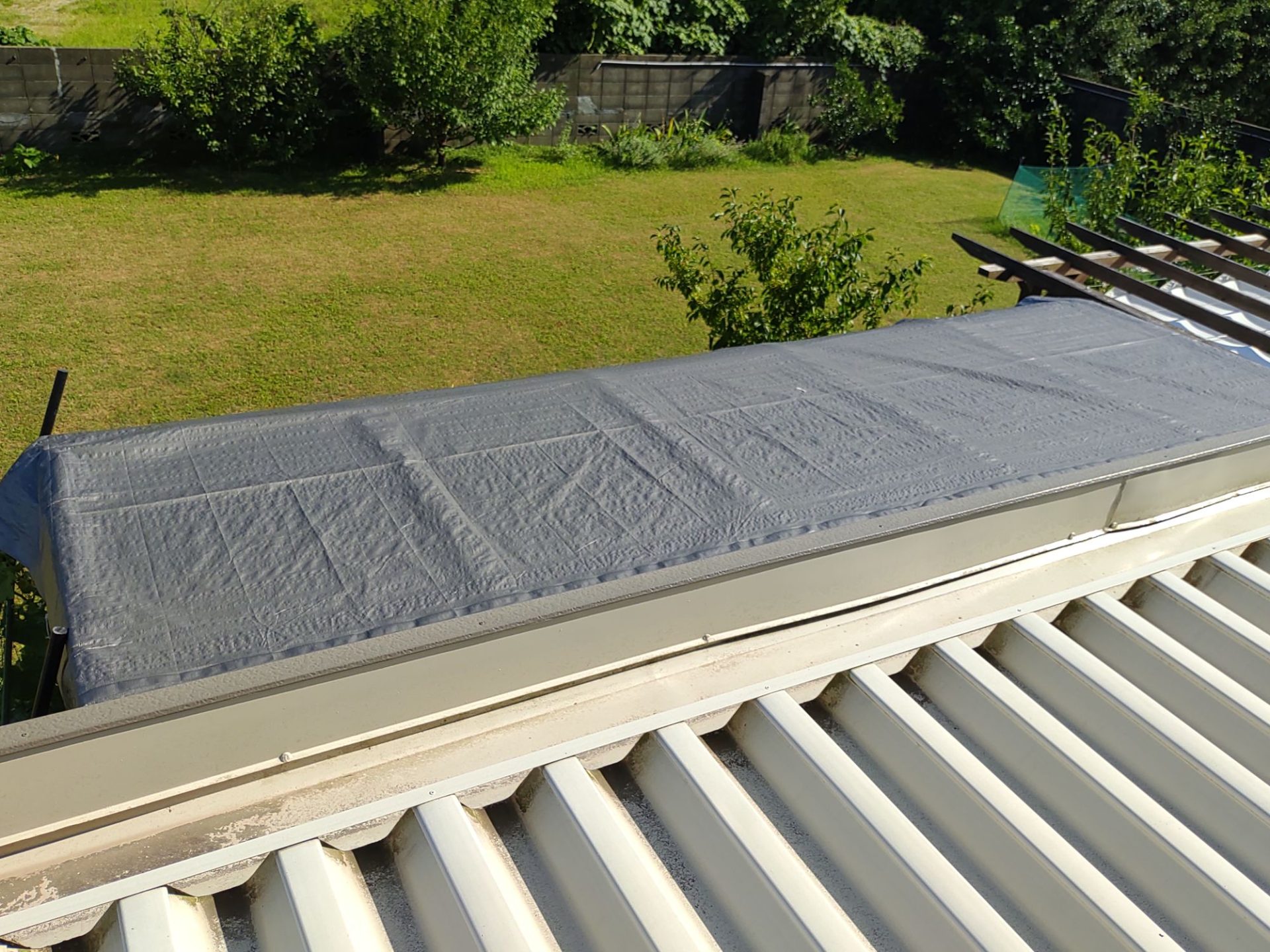 サンルームを犬専用の部屋にしたが、夏は暑熱対策が必要。厚手のサンシェードでガラス屋根全体を覆った。