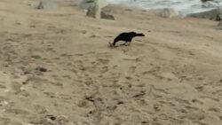 ハシボソカラス 朝ん歩 カニを捕って食べるカラス 車のガラスをつつくカラス